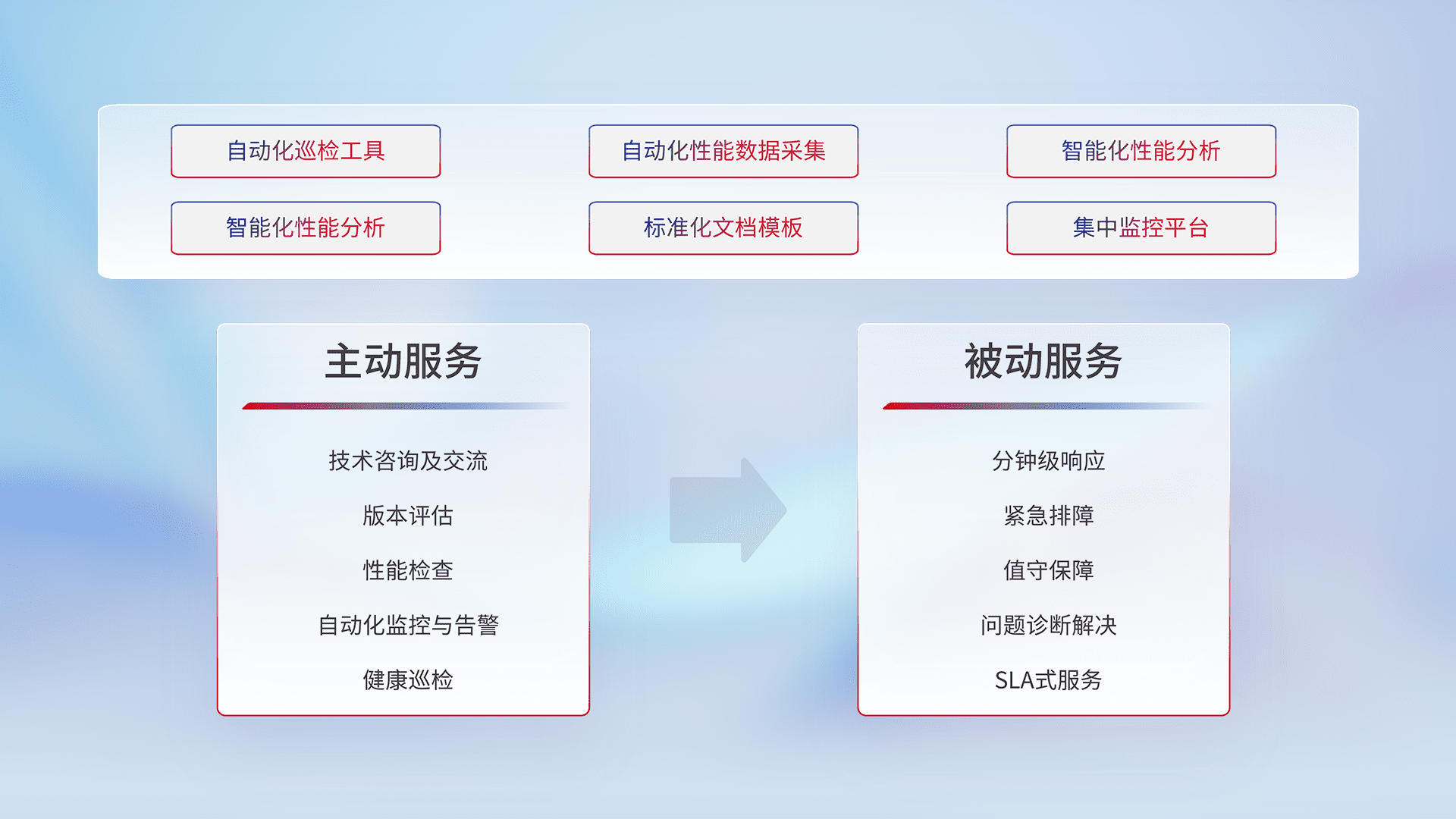 智能化工具和标准化文档,,保障服务质量,,,提供主动服务(包含技术咨询、、、版本评估、、、性能检查、、、、自动化监控与告警、、、、健康巡检)和被动服务包含(分钟级响应、、、紧急排障、、值守保障、、、问题诊断解决、、、、SLA服务)。。。。